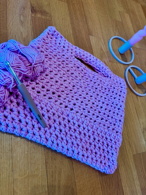 Vesken på bildet er heklet i fargen 70 - kirsebærblomst.