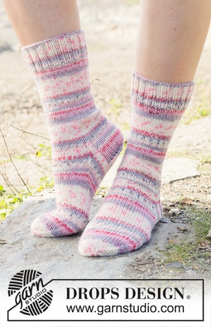 Sokkene på bildet er strikket i farge 19 - Bær & krem.
