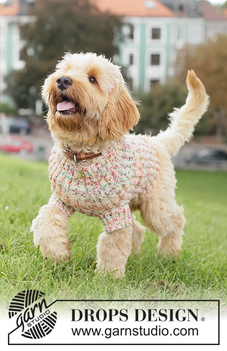 Strikkepakke til den søte hundegenseren Happy Tails Dog Sweater strikket i DROPS Fiesta. Arbeidet strikkes fra halsen til halen med vrangbord. Kommer i størrelse XS-M. Velg farge og størrelse.