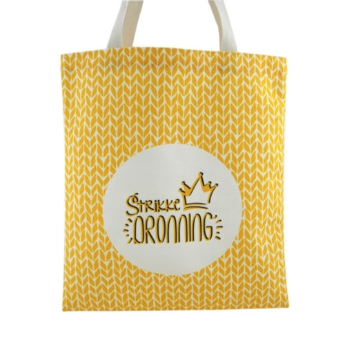 Kjempefint gult nett til å oppbevare strikketøyet i med teksten Strikkedronning.